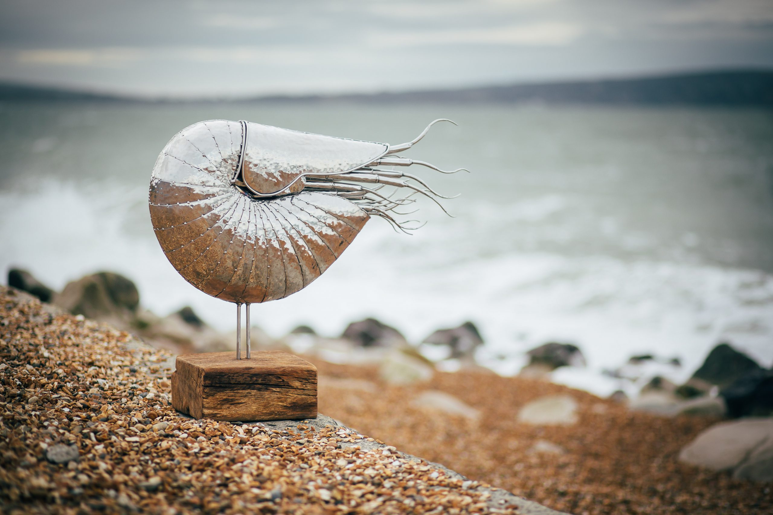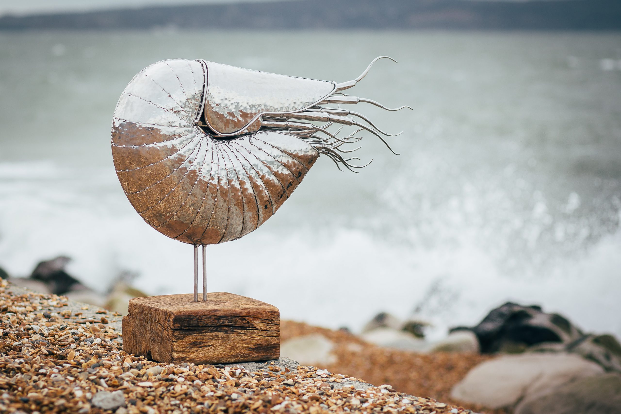 The Giant Nautilus sculpture is a larger take on the original smaller nautilus. The sculpture is a really stunning piece of artwork and will look at home in any kitchen or a unique garden sculpture. Resting on a piece of hardwood, the stainless steel and wood make a beautiful contrast.