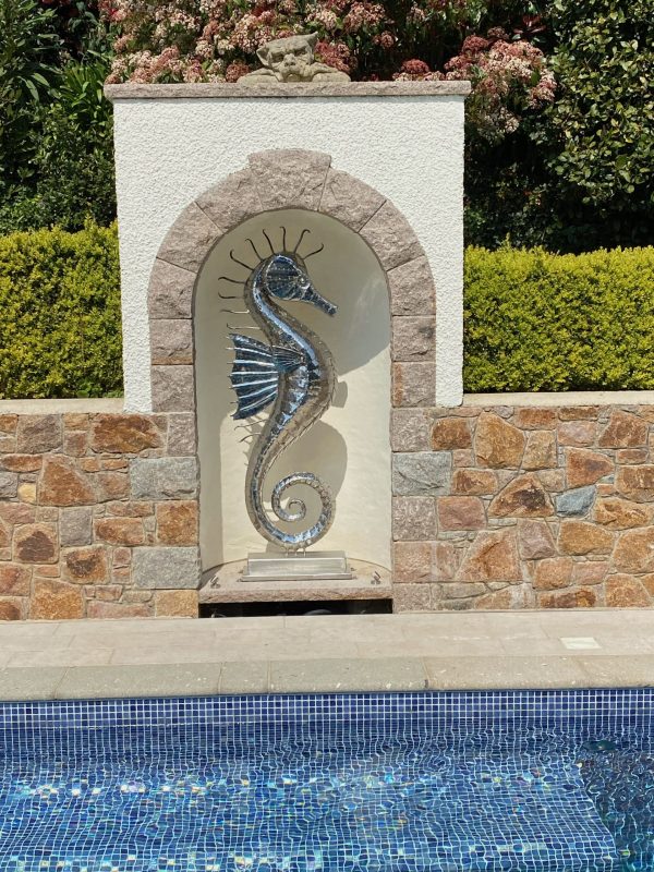 A Stunning large Seahorse sculpture for your garden. This is the large seahorse sculpture, compared to the original Michael Turner seahorse on wood sculpture for your sideboard. This garden sculpture was commissioned for a beautiful home, with the seahorse sitting beside the beautiful swimming pool.