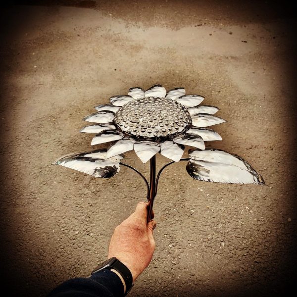 This beautiful Sunflower made in Stainless Steel joins the family of Flowers Michael has made. If you wish the flower to have height, just get in touch and we can add this for you (this may incur extra postage if not collected in person). The one seen here is approximately 35cm. Each Sunflower sculpture has 2 petals, which creates a great space if you want to have a special message underneath.